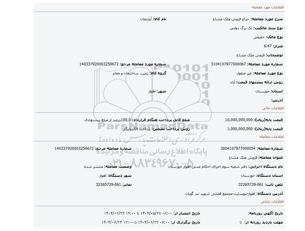 مزایده عمومی مزایده فروش ملک مشاع برگزار میگردد. از کلیه افراد متخصص و شرکتهای واجد شرایط دعوت به عمل میآید تا در این مزایده با کد خبرگزاری پارس نماد : 9432037 شرکت نمایند تاریخ شروع مزایده : 1404/05/28 مهلت شرکت در مزایده: تا پایان روز 1404/06/23