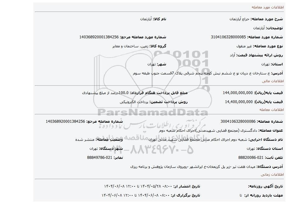 شرح مورد معامله: حراج آپارتماننام کالا: آپارتمان