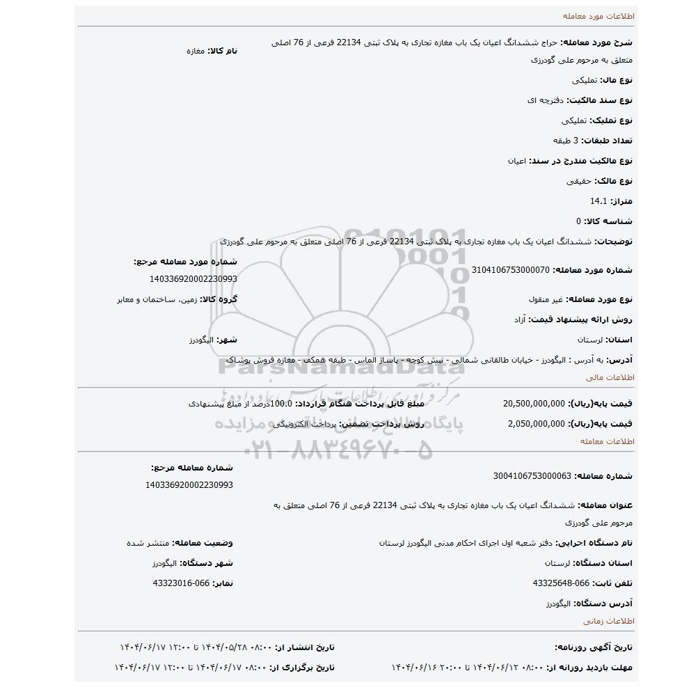 عنوان معامله: ششدانگ اعیان یک باب مغازه تجاری به پلاک ثبتی 22134 فرعی از 76 اصلی متعلق به مرحوم علی گودرزی