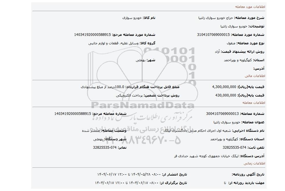 شرح مورد معامله: حراج خودرو سواری زانتیا | نام کالا: خودرو سواری | |