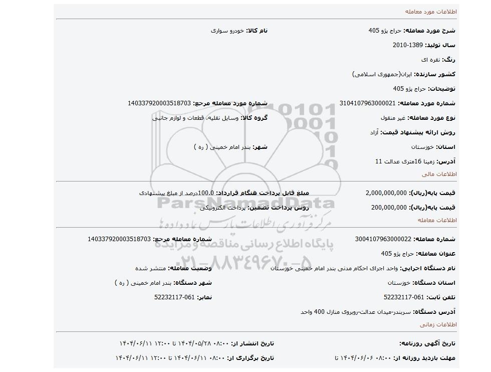 مزایده عمومی مزایده حراج پژو 405 برگزار میگردد. از کلیه افراد متخصص و شرکتهای واجد شرایط دعوت به عمل میآید تا در این مزایده با کد خبرگزاری پارس نماد : 9432054 شرکت نمایند تاریخ شروع مزایده : 1404/05/28 مهلت شرکت در مزایده: تا پایان روز 1404/06/11