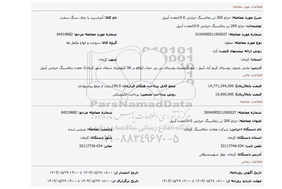 عنوان معامله: حراج 200 تن زغالسنگ حرارتی 0-10معدن آبنیل | ||