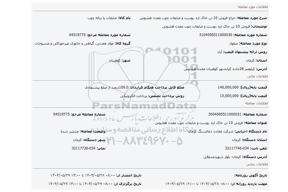 عنوان معامله: فروش 10 تن خاک اره ،پوست و ضایعات چوب معدن هشونی | ||