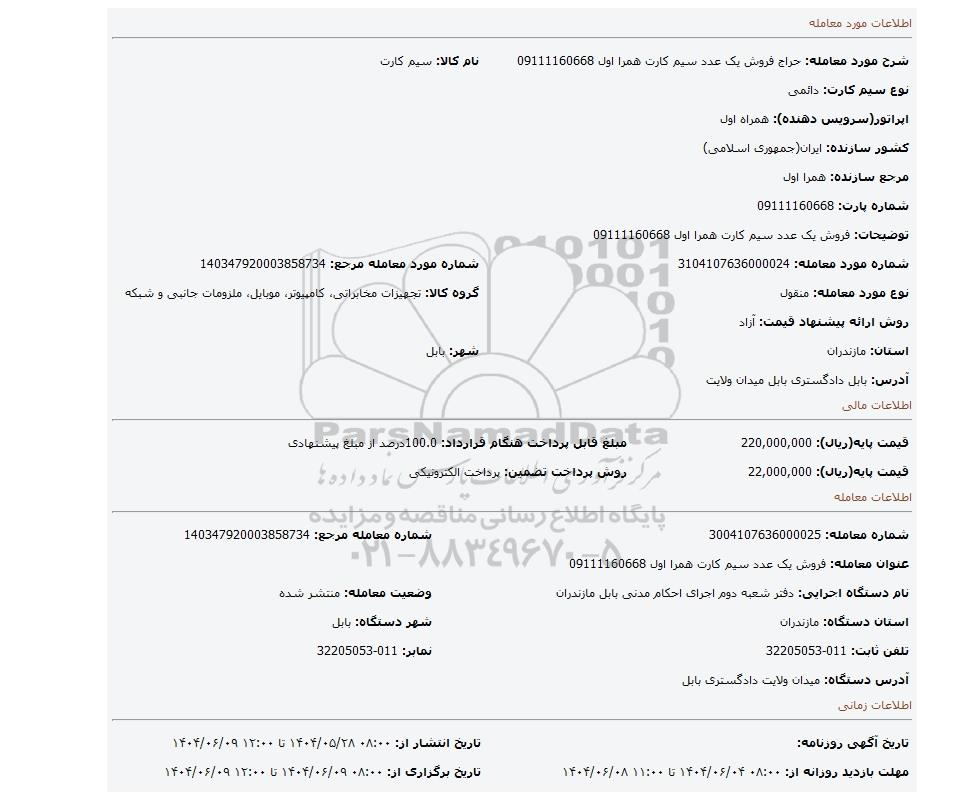 مزایده، فروش یک عدد سیم کارت همرا اول 09111160668