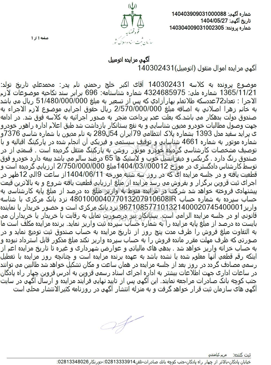 موضوع: مزایده خودروی پراید سفید مدل 1393 به مبلغ 2.750.000.000 ریال