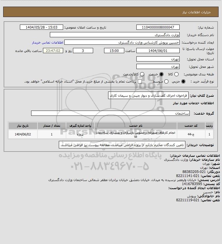 شرح کلی نیاز: فراخوان اجرای کف سازی و دیوار چینی و سیمان کاری