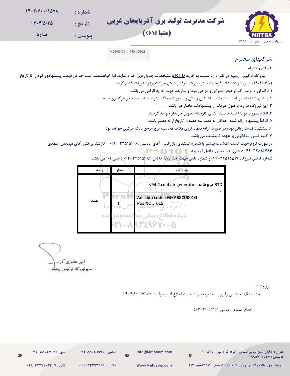 نیروگاه ترکیبی ارومیه در نظر دارد نسبت به خرید RTD با مشخصات جدول ذیل اقدام نماید. لذا خواهشمند است حداقل قیمت پیشنهادی خود را تا تاریخ 1404.6.1 به این شرکت اعلام فرمایید تا در صورت صرفه و صلاح شرکت برابر مقررات اقدام گردد.