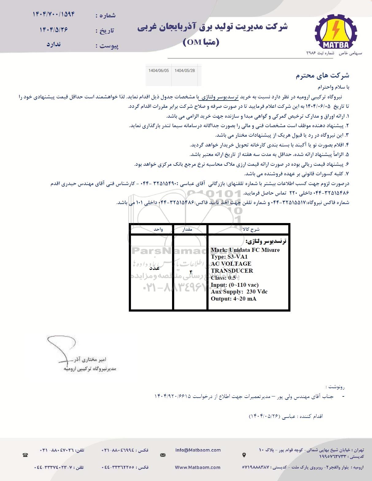 نیروگاه ترکیبی ارومیه در نظر دارد نسبت به خرید ترسدیوسر ولتاژی با مشخصات جدول ذیل اقدام نماید. لذا خواهشمند است حداقل قیمت پیشنهادی خود را تا تاریخ 1404.6.5 به این شرکت اعلام فرمایید تا در صورت صرفه و صلاح شرکت برابر مقررات ذیل اقدام گردد.