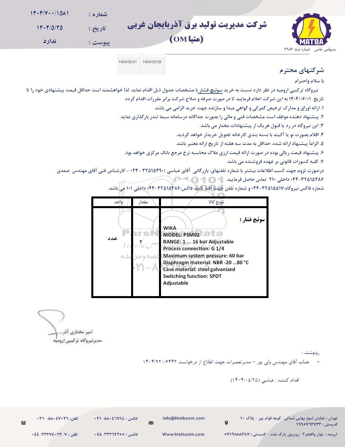 نیروگاه ترکیبی ارومیه در نظر دارد نسبت به خرید سوئیچ فشار با مشخصات جدول ذیل اقدام نماید. لذا خواهشمند است حداقل قیمت پیشنهادی خود را تا