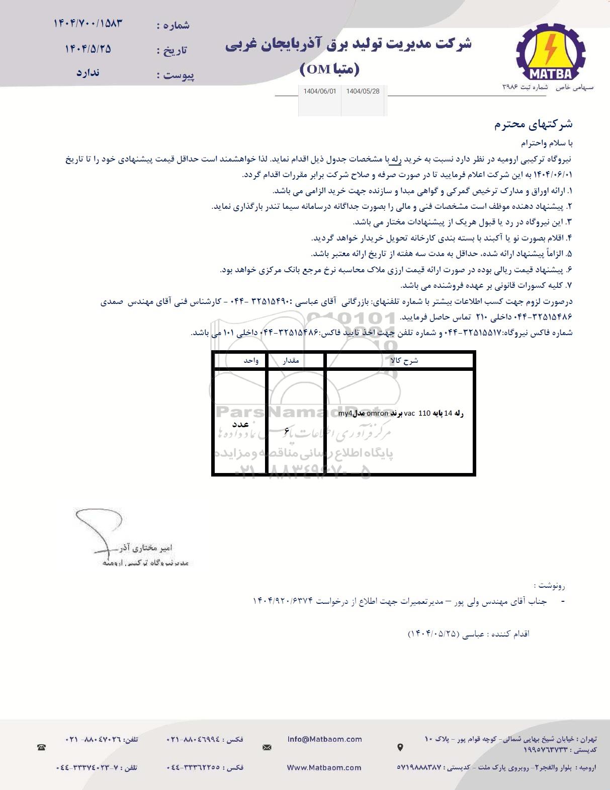 نیروگاه ترکیبی ارومیه در نظر دارد نسبت به خرید رله با مشخصات جدول ذیل اقدام نماید. لذا خواهشمند است حداقل قیمت پیشنهادی خود را تا تاریخ 1404.6.1 به این شرکت اعلام فرمایید تا در صورت صرفه و صلاح شرکت برابر مقررات اقدام گردد.