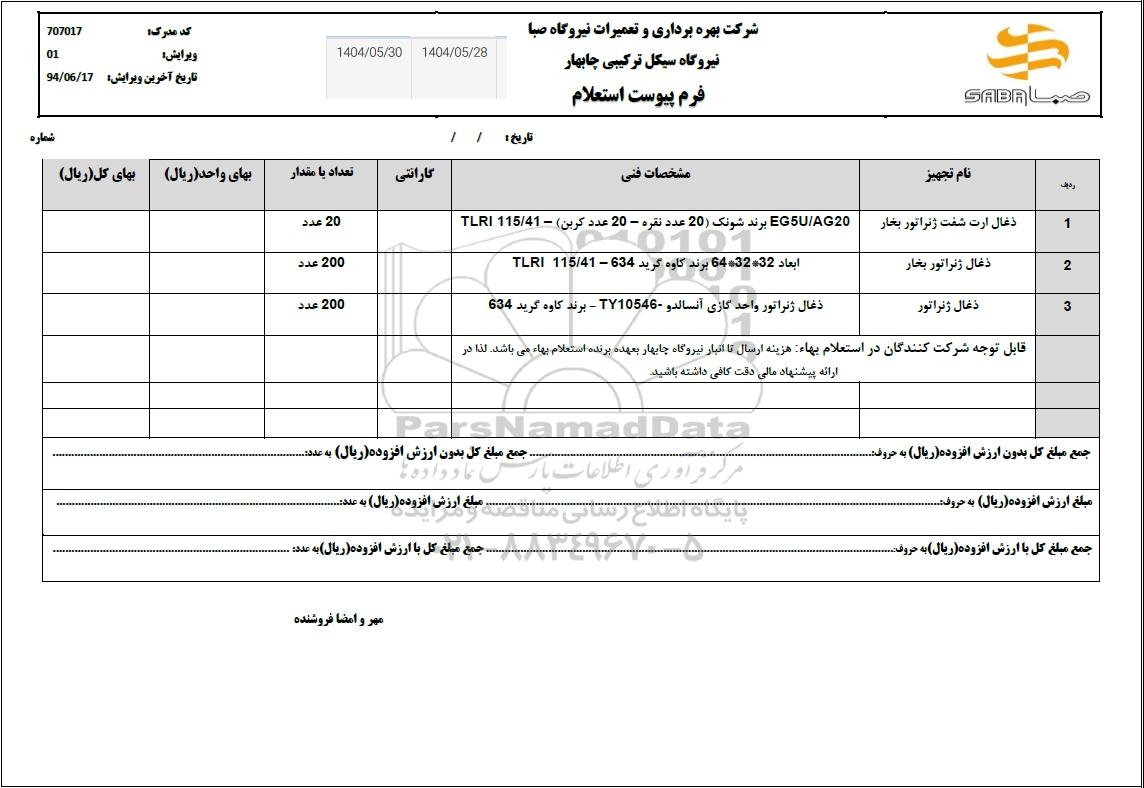 قابل توجه شرکت کنندگان در استعلام بهاء هزینه ارسال تا انبار نیروگاه چابهار بعهده برنده استعلام بها، می باشد. لذا در ارائه پیشنهاد مالی دقت کافی داشته باشید.