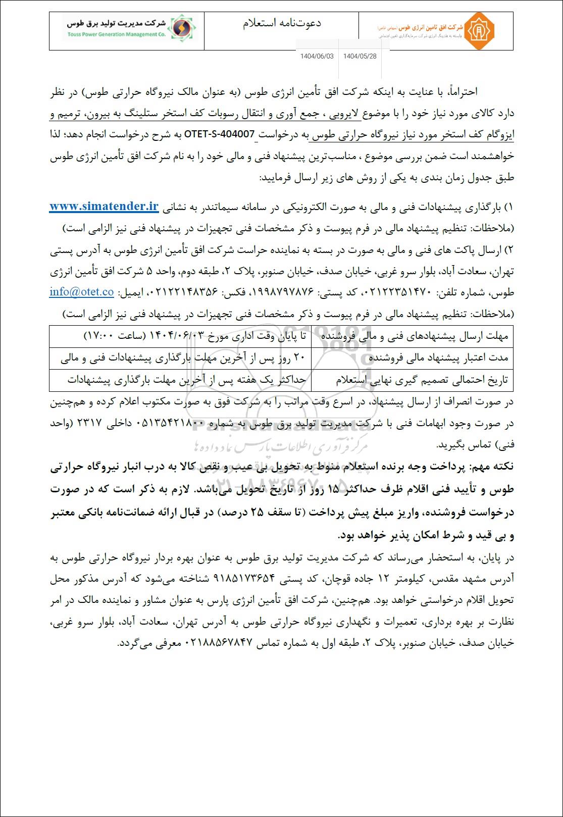 احتراماً با عنایت به اینکه شرکت افق تأمین انرژی طوس (به عنوان مالک نیروگاه حرارتی طوس) در نظر دارد کالای مورد نیاز خود را با موضوع لایروبی، جمع آوری و انتقال رسوبات کف استخر ستلینگ به بیرون، ترمیم و ایزوگام کف استخر مورد نیاز نیروگاه حرارتی طوس به درخواست خرید 404007-OTET-S به شرح درخواست خریداری نماید؛ خواهشمند است ضمن بررسی موضوع و مشخصات فنی مناسب ترین پیشنهاد فنی و مالی خود را به نام شرکت افق تأمین انرژی طوس طبق جدول زمان بندی به یکی از روش های زیر ارسال فرمایید:
