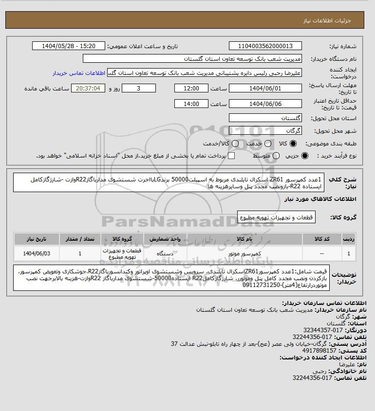 شرح کلی نیاز: 1عدد کمپرسور ZR61 اسکرال تایلندی مربوط به اسپیلت50000 برندLGبااجرت شستشوی مدارباگازR22وازت -شارژگازکامل ایستاده R22-بازونصب مجدد پنل وسایرهزینه ها