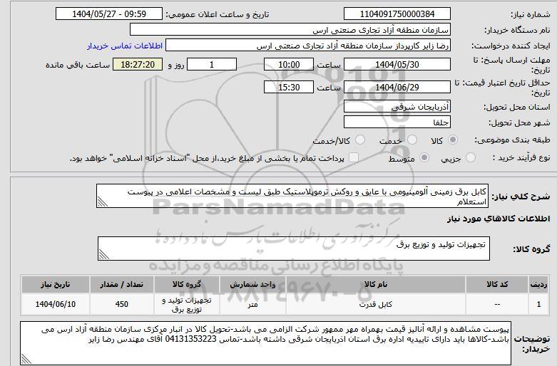 شرح کلی نیاز: کابل برق زمینی آلومینیومی با عایق و روکش ترموپلاستیک طبق لیست و مشخصات اعلامی در پیوست