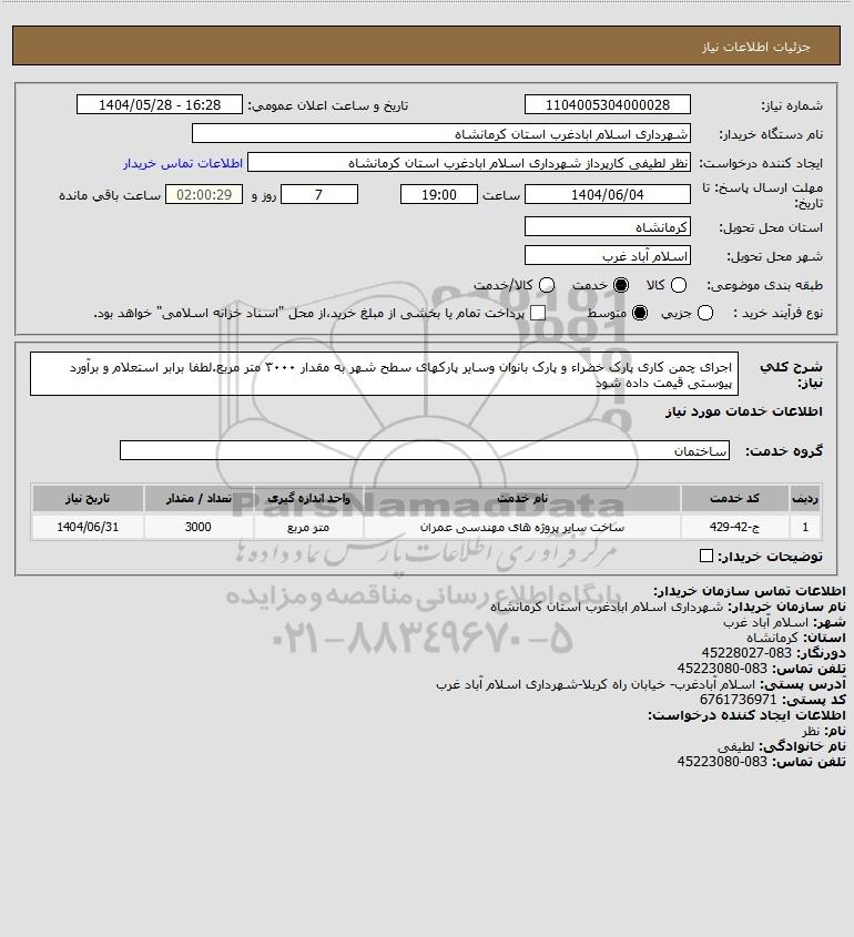 شرح کلی نیاز: اجرای چمن کاری پارک خضراء و پارک بانوان وسایر پارکهای سطح شهر به مقدار ۳۰۰۰ متر مربع.لطفا برابر استعلام و برآورد پیوستی قیمت داده شود