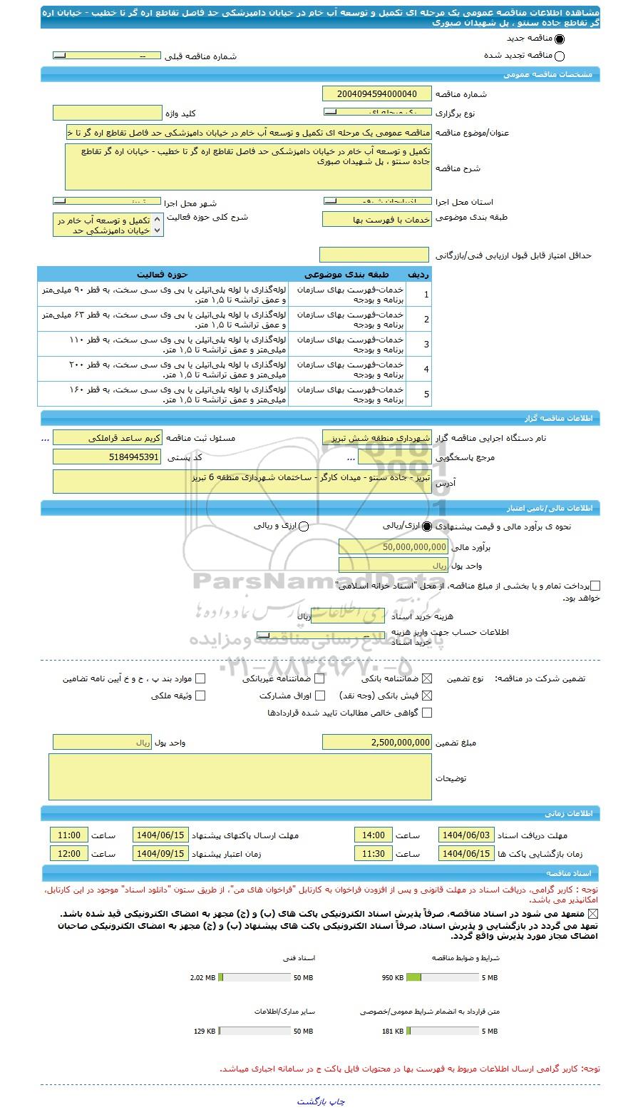 | طبقه بندی موضوعی | خدمات با فهرست بها | شرح کلی حوزه فعالیت | تکمیل و توسعه آب خام در خیابان دامپزشکی حد فاصل تقاطع اره گر تا خطیب - خیابان اره گر تقاطع جاده سنتو ، پل شهیدان صبوری | ||||||||||||||||||