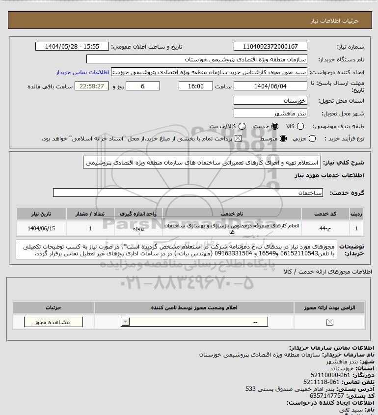 شرح کلی نیاز: استعلام تهیه و اجرای کارهای تعمیراتی ساختمان های سازمان منطقه ویژه اقتصادی پتروشیمی