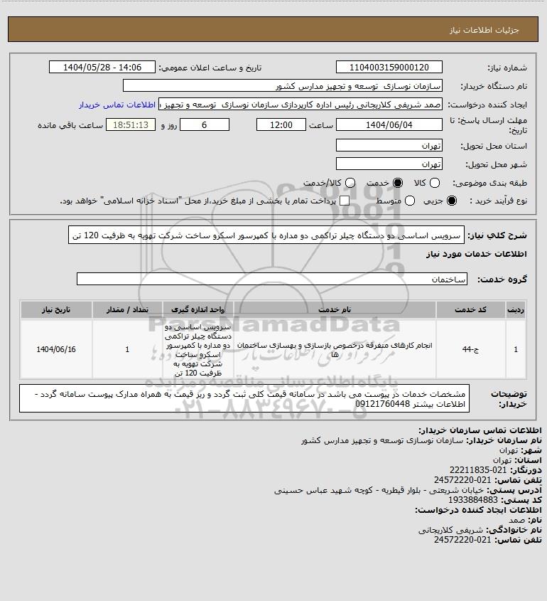 شرح کلی نیاز: سرویس اساسی دو دستگاه چیلر تراکمی دو مداره با کمپرسور اسکرو ساخت شرکت تهویه به ظرفیت 120 تن