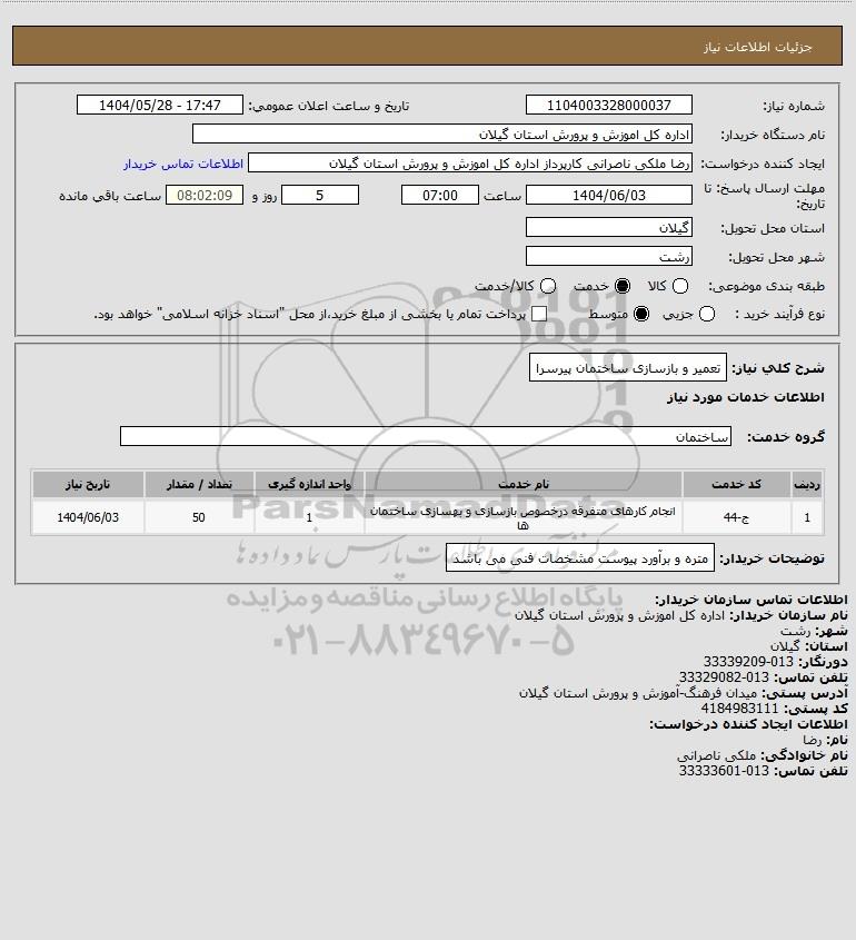 شرح کلی نیاز: تعمیر و بازسازی ساختمان پیرسرا