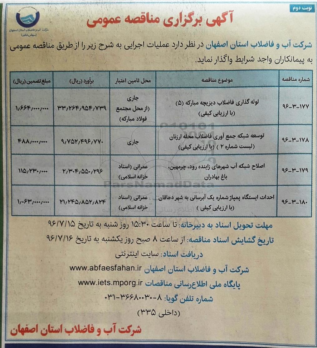 شرکت آب و فاضلاب استان اصفهان در نظر دارد عملیات اجرایی به شرح زیر را از طریق مناقصه عمومی به پیمانکاران واجد شرایط واگذار نماید.