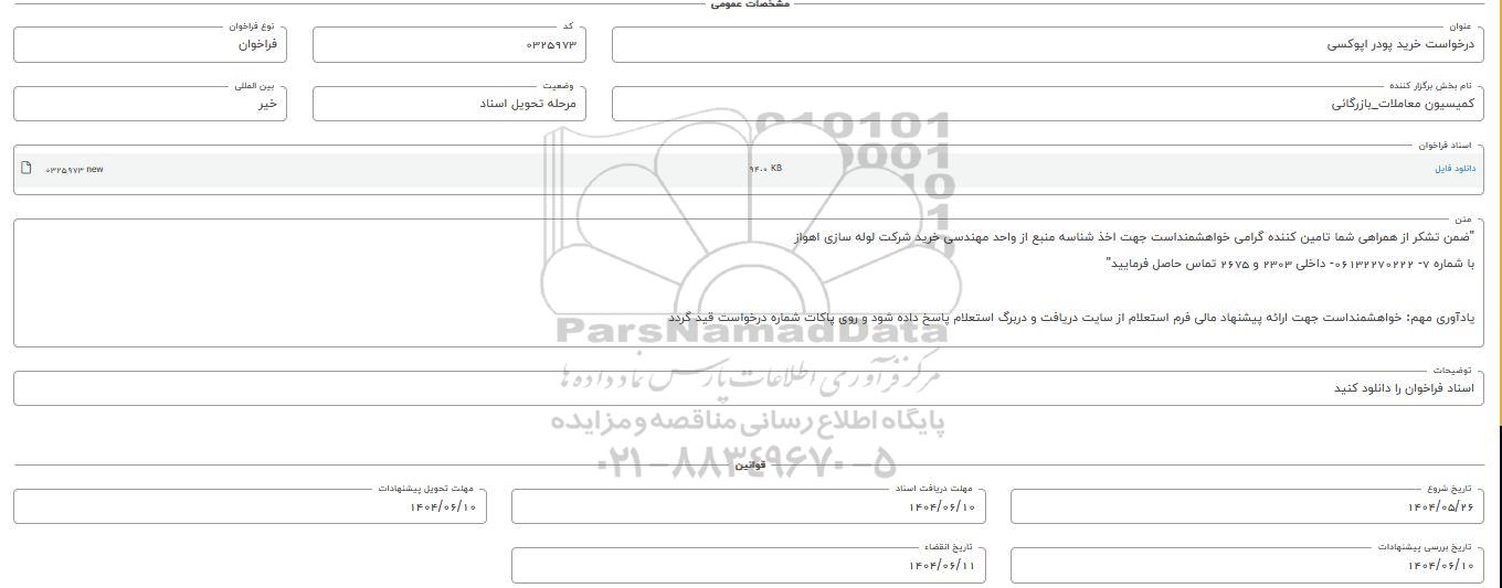 نحوه دریافت اسناد و ارسال پیشنهاد: متقاضیان میتوانند با ثبت نام در سامانه مناقصات و مزایدات ایران (پارس نماد) نسبت به مشاهده اسناد استعلام، دریافت اطلاعات تکمیلی، و ثبت پیشنهاد قیمت خود اقدام نمایند. در صورت نیاز به دریافت راهنمایی یا پشتیبانی در خصوص استعلام و مناقصه و فراخوان مناقصه عمومی، مناقصه محدود، مناقصه بین المللی، مناقصه دولتی، مناقصه خصوصی، مناقصه آنلاین فروش تجهیزات، مناقصه مشاورهای مناقصه پتروشیمی و انرژی مناقصه صنایع و تجهیزات برق و مخابرات و نفت و گاز ... لطفاً با سایت خبری مناقصه و مزایده پارسنماد دادهها به شماره 88349670 تماس حاصل فرمایید.