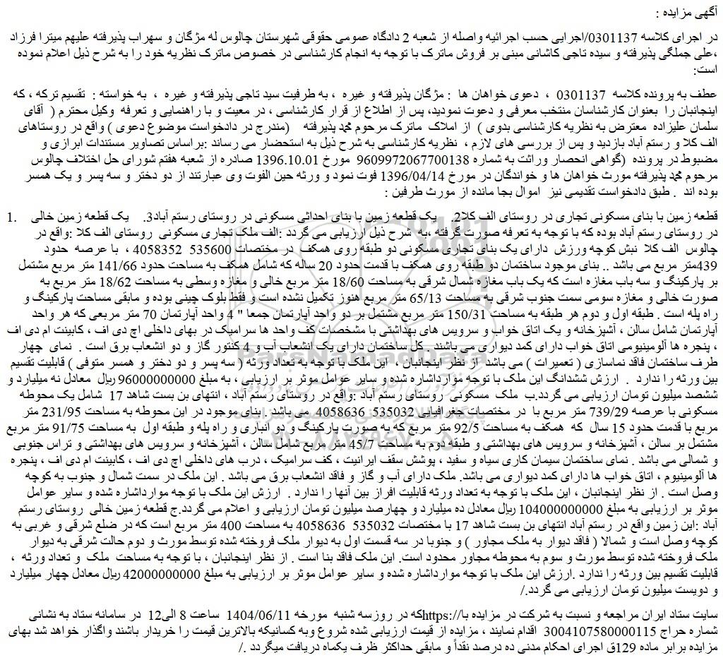 در اجرای کلاسه 0301137/اجرایی حسب اجرائیه واصله از شعبه 2 دادگاه عمومی حقوقی شهرستان چالوس له مژگان و سهراب پذیرفته علیهم میترا فرزاد ،علی جملگی پذیرفته و سیده تاجی کاشانی مبنی بر فروش ماترک با توجه به انجام کارشناسی در خصوص ماترک نظریه خود را به شرح ذیل اعلام نموده است: