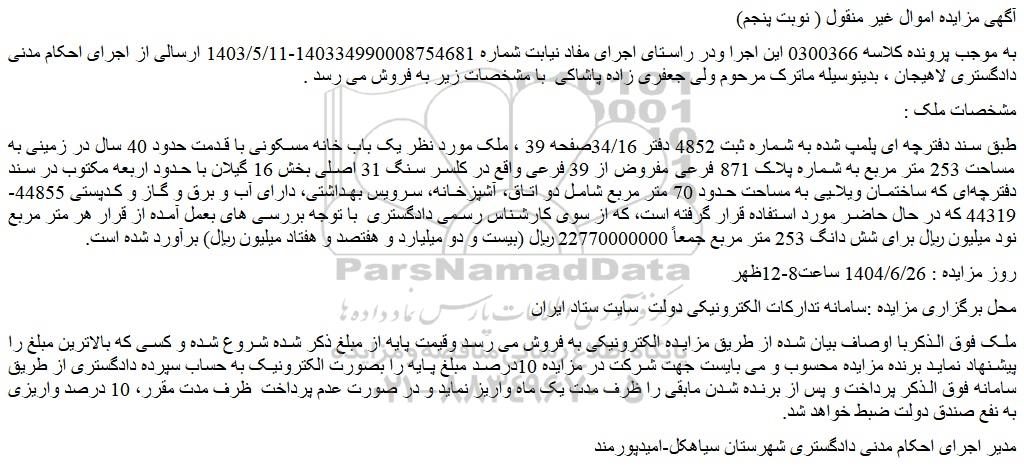 به موجب پرونده کلاسه 0300366 این اجرا ودر راستای اجرای مفاد نیابت شماره 140334990008754681-1403/5/11 ارسالی از اجرای احکام مدنی دادگستری لاهیجان ، بدینوسیله ماترک مرحوم ولی جعفری زاده پاشاکی  با مشخصات زیر به فروش می رسد .