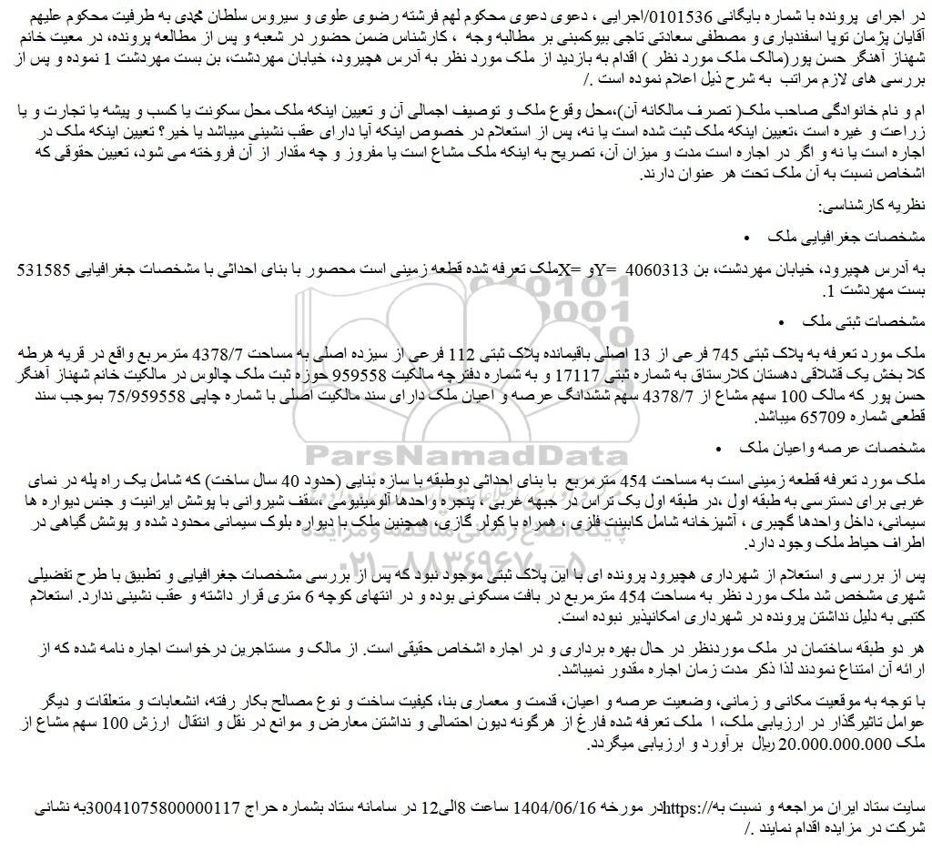 در اجرای پرونده با شماره بایگانی 0101536/اجرایی ، دعوی دعوی محکوم لهم فرشته رضوی علوی و سیروس سلطان محمدی به طرفیت محکوم علیهم آقایان پژمان توپا اسفندیاری و مصطفی سعادتی تاجی بیوکمبنی بر مطالبه وجه ، کارشناس ضمن حضور در شعبه و پس از مطالعه پرونده، در معیت خانم شهناز آهنگر حسن پور(مالک ملک مورد نظر ) اقدام به بازدید از ملک مورد نظر به آدرس هچیرود، خیابان مهردشت، بن بست مهردشت 1 نموده و پس از بررسی های لازم مراتب به شرح ذیل اعلام نموده است ./