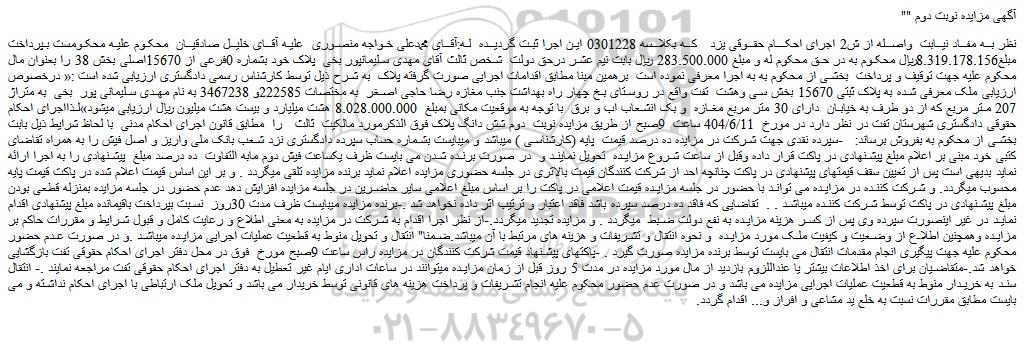 نظر به مفاد نیابت واصله از ش2 اجرای احکام حقوقی یزد که بکلاسه 0301228 این اجرا ثبت گردیده له:آقای محمدعلی خواجه منصوری علیه آقای خلیل صادقیان محکوم علیه محکومست بپرداخت مبلغ8.319.178.156ریال محکوم به در حق محکوم له و مبلغ 283.500.000 ریال بابت نیم عشر درحق دولت شخص ثالث آقای مهدی سلیمانپور بخی پلاک خود بشماره 0فرعی از 15670اصلی بخش 38 را بعنوان مال محکوم علیه جهت توقیف و پرداخت بخشی از محکوم به به اجرا معرفی نموده است برهمین مبنا مطابق اقدامات اجرایی صورت گرفته پلاک به شرح ذیل توسط کارشناس رسمی دادگستری ارزیابی شده است :« درخصوص ارزیابی ملک معرفی شده به پلاک ثبتی 15670 بخش سی وهشت تفت واقع در روستای بخ چهار راه بهداشت جنب مغازه رضا حاجی اصغر به مختصات 222585و 3467238 به نام مهدی سلیمانی پور بخی به متراژ 207 متر مربع که از دو طرف به خیابان دارای 30 متر مربع مغازه و بک انشعاب اب و برق با توجه به موقعیت مکانی بمبلغ 8.028.000.000 هشت میلیارد و بیست هشت میلیون ریال ارزیابی میشود»لذااجرای احکام حقوقی دادگستری شهرستان تفت در نظر دارد در مورخ 404/6/11 ساعت 9صبح از طریق مزایده نوبت دوم شش دانگ پلاک فوق الذکرمورد مالکیت ثالث را مطابق قانون اجرای احکام مدنی با لحاظ شرایط ذیل بابت بخشی از محکوم به بفروش برساند: -سپرده نقدی جهت شرکت در مزایده ده درصد قیمت پایه (کارشناسی ) میباشد و میبایست بشماره حساب سپرده دادگستری نزد شعب بانک ملی واریز و اصل فیش را به همراه تقاضای کتبی خود مبنی بر اعلام مبلغ پیشنهادی در پاکت قرار داده وقبل از ساعت شروع مزایده تحویل نمایند و در صورت برنده شدن می بایست ظرف یکساعت فیش دوم مابه التفاوت ده درصد مبلغ پیشنهادی را به اجرا ارائه نماید بدیهی است پس از تعیین سقف قیمتهای پیشنهادی در پاکت چنانچه احد از شرکت کنندگان قیمت بالاتری در جلسه حضوری مزایده اعلام نماید برنده مزایده تلقی میگردد . و بر این اساس قیمت اعلام شده در پاکت قیمت پایه محسوب میگردد. و شرکت کننده در مزایده می تواند با حضور در جلسه مزایده قیمت اعلامی در پاکت را بر اساس مبلغ اعلامی سایر حاضرین در جلسه مزایده افزایش دهد عدم حضور در جلسه مزایده بمنزله قطعی بودن مبلغ پیشنهادی در پاکت توسط شرکت کننده میباشد . . تقاضایی که فاقد ده درصد سپرده باشد فاقد اعتبار و ترتیب اثر داده نخواهد شد .-برنده مزایده میبایست ظرف مدت 30روز نسبت بپرداخت باقیمانده مبلغ پیشنهادی اقدام نماید در غیر اینصورت سپرده وی پس از کسر هزینه مزایده به نفع دولت ضبط میگردد . و مزایده تجدید میگردد.-از نظر اجرا اقدام به شرکت در مزایده به معنی اطلاع و رعایت کامل و قبول شرایط و مقررات حاکم بر مزایده وهمچنین اطلاع از وضعیت و کیفیت ملک مورد مزایده و نحوه انتقال و تشریفات و هزینه های مرتبط با آن میباشد.ضمنا" انتقال و تحویل منوط به قطعیت عملیات اجرایی مزایده میباشد .و در صورت عدم حضور محکوم علیه جهت پیگیری انجام مقدمات انتقال می بایست توسط برنده مزایده صورت گیرد . -پاکتهای پیشنهاد قیمت شرکت کنندگان در مزایده راس ساعت 9صبح مورخ فوق در محل دفتر اجرای احکام حقوقی تفت بازگشایی خواهد شد.-متقاضیان برای اخذ اطلاعات بیشتر یا عنداللزوم بازدید از مال مورد مزایده در مدت 5 روز قبل از زمان مزایده میتوانند در ساعات اداری ایام غیر تعطیل به دفتر اجرای احکام حقوقی تفت مراجعه نمایند .- انتقال سند به خریدار منوط به قطعیت عملیات اجرایی مزایده می باشد و در صورت عدم حضور محکوم علیه انجام تشریفات و پرداخت هزینه های قانونی توسط خریدار می باشد و تحویل ملک ارتباطی با اجرای احکام نداشته و می بایست مطابق مقررات نسبت به خلع ید مشاعی و افراز و... اقدام گردد.