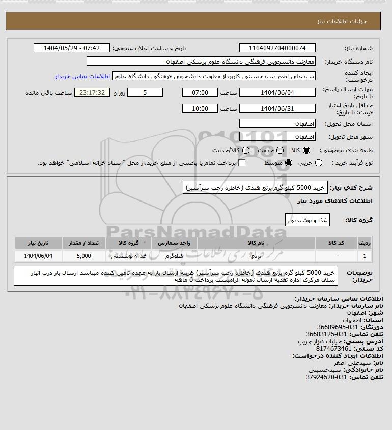 شرح کلی نیاز: خرید 5000 کیلو گرم برنج هندی (خاطره رجب سرآشپز)