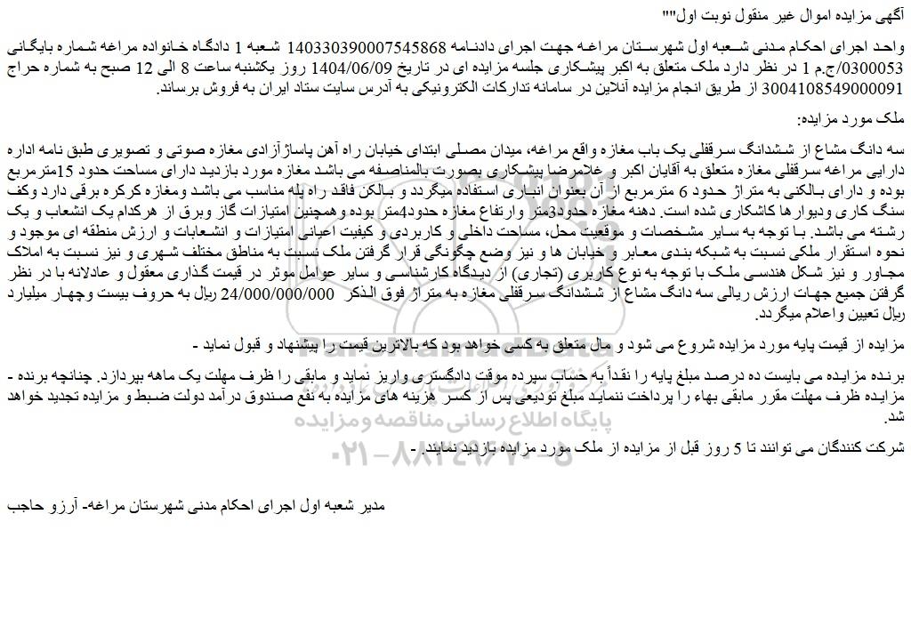 واحد اجرای احکام مدنی شعبه اول شهرستان مراغه جهت اجرای دادنامه 140330390007545868 شعبه 1 دادگاه خانواده مراغه شماره بایگانی 0300053/ج.م 1 در نظر دارد ملک متعلق به اکبر پیشکاری جلسه مزایده ای در تاریخ 1404/06/09 روز یکشنبه ساعت 8 الی 12 صبح به شماره حراج 3004108549000091 از طریق انجام مزایده آنلاین در سامانه تدارکات الکترونیکی به آدرس سایت ستاد ایران به فروش برساند.