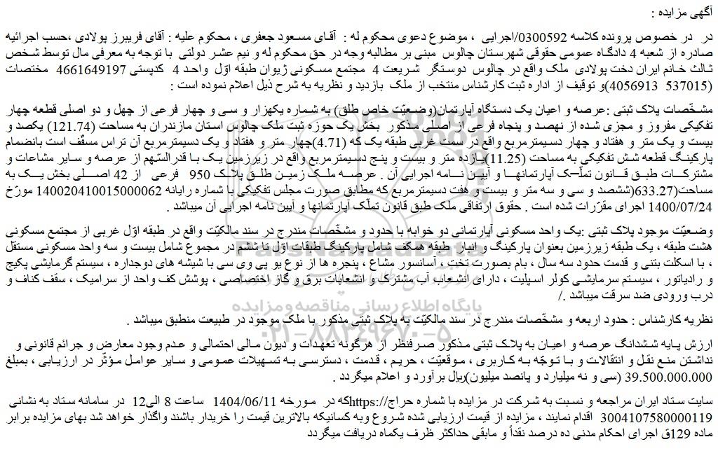 در در خصوص پرونده کلاسه 0300592/اجرایی ، موضوع دعوی محکوم له : آقای مسعود جعفری ، محکوم علیه : آقای فریبرز پولادی ،حسب اجرائیه صادره از شعبه 4 دادگاه عمومی حقوقی شهرستان چالوس مبنی بر مطالبه وجه در حق محکوم له و نیم عشر دولتی با توجه به معرفی مال توسط شخص ثالث خانم ایران دخت پولادی ملک واقع در چالوس دوستگر شریعت 4 مجتمع مسکونی ژیوان طبقه اوّل واحد 4 کدپستی 4661649197 مختصات (537015 4056913)و توقیف از اداره ثبت کارشناس منتخب از ملک بازدید و نظریه به شرح ذیل اعلام نموده است :
