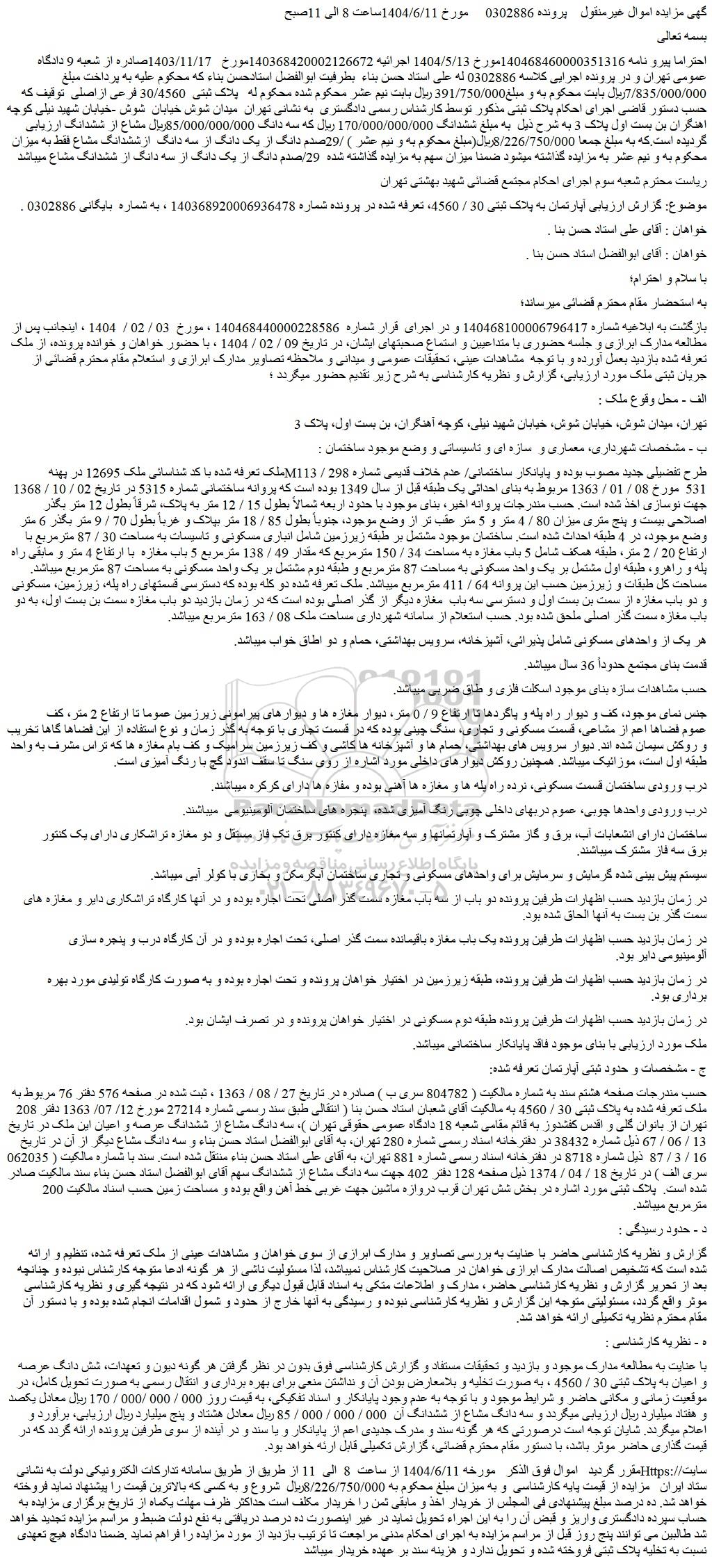 احتراما پیرو نامه 140468460000351316مورخ 1404/5/13 اجرائیه 140368420002126672مورخ 1403/11/17صادره از شعبه 9 دادگاه عمومی تهران و در پرونده اجرایی کلاسه 0302886 له علی استاد حسن بناء بطرفیت ابوالفضل استادحسن بناء که محکوم علیه به پرداخت مبلغ 7/835/000/000ریال بابت محکوم به و مبلغ391/750/000 ریال بابت نیم عشر محکوم شده محکوم له پلاک ثبتی 30/4560 فرعی ازاصلی توقیف که حسب دستور قاضی اجرای احکام پلاک ثبتی مذکور توسط کارشناس رسمی دادگستری به نشانی تهران میدان شوش خیابان شوش -خیابان شهید نیلی کوچه اهنگران بن بست اول پلاک 3 به شرح ذیل به مبلغ ششدانگ 170/000/000/000 ریال که سه دانگ 85/000/000/000ریال مشاع از ششدانگ ارزیابی گردیده است.که به مبلغ جمعا 8/226/750/000ریال(مبلغ محکوم به و نیم عشر ) /29صدم دانگ از یک دانگ از سه دانگ ازششدانگ مشاع فقط به میزان محکوم به و نیم عشر به مزایده گذاشته میشود ضمنا میزان سهم به مزایده گذاشته شده 29/صدم دانگ از یک دانگ از سه دانگ از ششدانگ مشاع میباشد