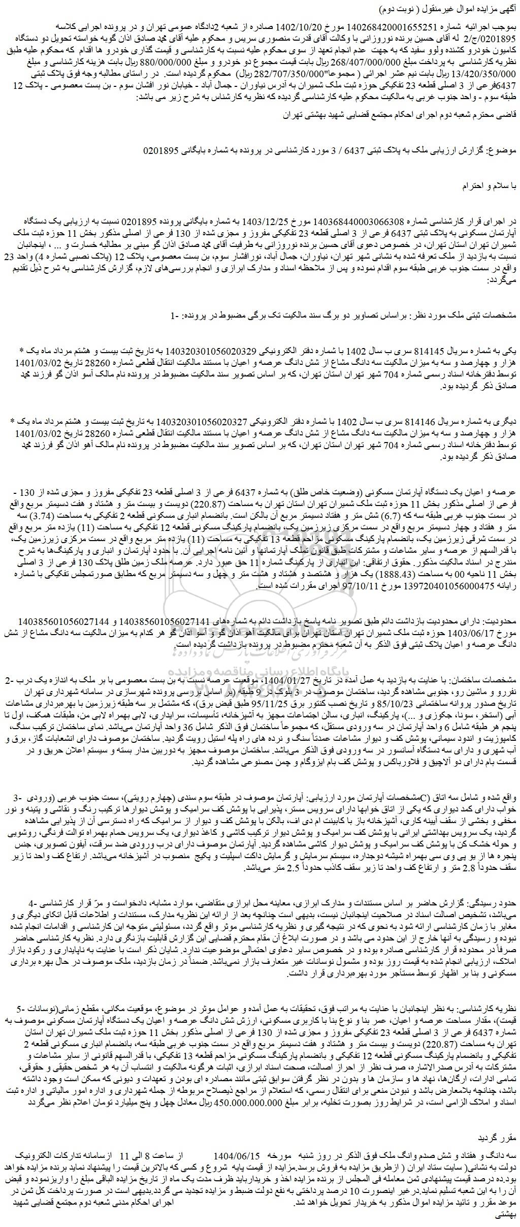 بموجب اجرائیه شماره 140268420001655251 مورخ 1402/10/20 صادره از شعبه 2دادگاه عمومی تهران و در پرونده اجرایی کلاسه 0201895/ج/2 له آقای حسین برنده نوروزانی با وکالت آقای قدرت منصوری سریس و محکوم علیه آقای محمد صادق اذان گوبه خواسته تحویل دو دستگاه کامیون خودرو کشنده ولوو سفید که به جهت عدم انجام تعهد از سوی محکوم علیه نسبت به کارشناسی و قیمت گذاری خودرو ها اقدام که محکوم علیه طبق نظریه کارشناسی به پرداخت مبلغ 268/407/000/000 ریال بابت قیمت مجموع دو خودرو و مبلغ 880/000/000 ریال بابت هزینه کارشناسی و مبلغ 13/420/350/000 ریال بابت نیم عشر اجرائی ( مجموعا"282/707/350/000 ریال) محکوم گردیده است. در راستای مطالبه وجه فوق پلاک ثبتی 6437فرعی از 3 اصلی قطعه 23 تفکیکی حوزه ثبت ملک شمیران به آدرس نیاوران - جمال آباد - خیابان نور افشان سوم - بن بست معصومی - پلاک 12 طبقه سوم - واحد جنوب غربی به مالکیت محکوم علیه کارشناسی گردیده که نظریه کارشناس به شرح زیر می باشد: