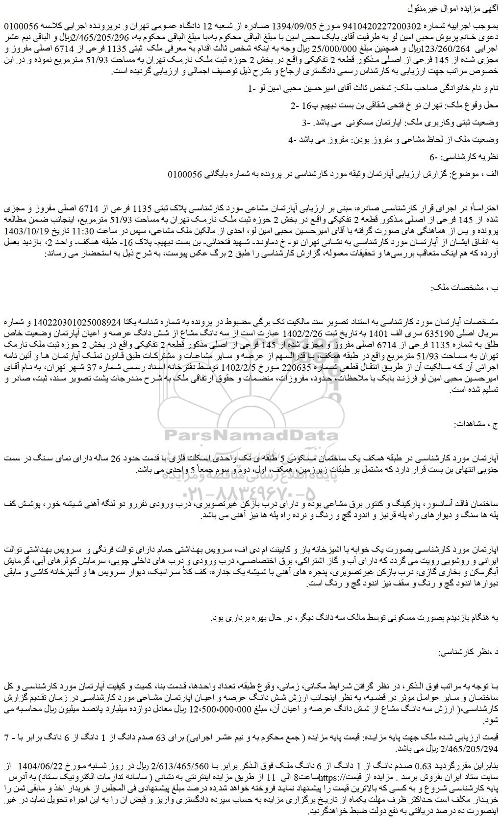 بموجب اجراییه شماره 9410420227200302 مورخ 1394/09/05 صادره از شعبه 12 دادگاه عمومی تهران و درپرونده اجرایی کلاسه 0100056 دعوی خانم پریوش محبی امین لو به طرفیت آقای بابک محبی امین با مبلغ الباقی محکوم به،با مبلغ الباقی محکوم به، 2/465/205/296ریال و الباقی نیم عشر اجرایی 123/260/264ریال و همچنین مبلغ 25/000/000 ریال وجه به اینکه شخص ثالث اقدام به معرفی ملک ثبتی 1135 فرعی از 6714 اصلی مفروز و مجزی شده از 145 فرعی از اصلی مذکور قطعه 2 تفکیکی واقع در بخش 2 حوزه ثبت ملک نارمک تهران به مساحت 51/93 مترمربع نموده و در این خصوص مراتب جهت ارزیابی به کارشناس رسمی دادگستری ارجاع و بشرح ذیل توصیف اجمالی و ارزیابی گردیده است.