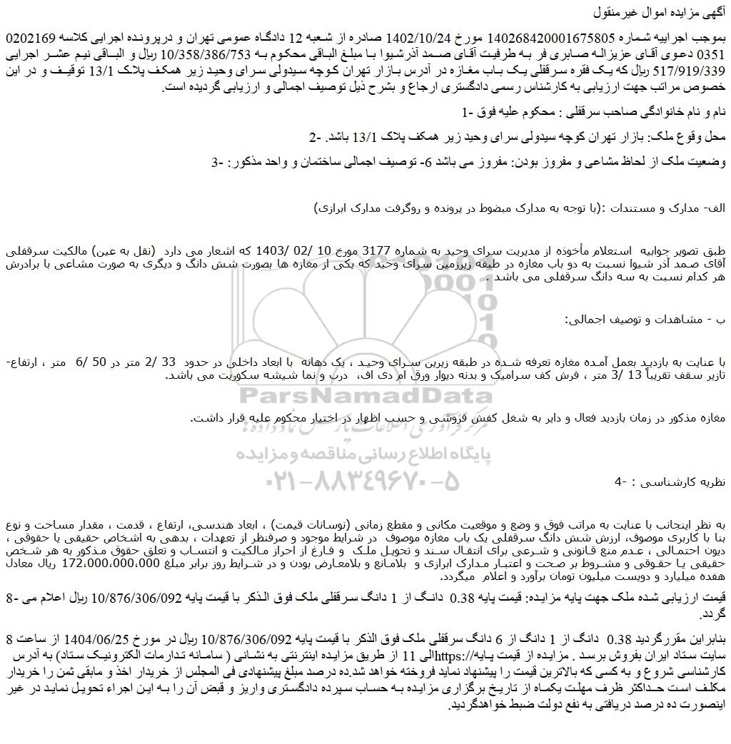 بموجب اجراییه شماره 140268420001675805 مورخ 1402/10/24 صادره از شعبه 12 دادگاه عمومی تهران و درپرونده اجرایی کلاسه 0202169 0351 دعوی آقای عزیزاله صابری فر به طرفیت آقای صمد آذرشیوا با مبلغ الباقی محکوم به 10/358/386/753 ریال و الباقی نیم عشر اجرایی 517/919/339 ریال که یک فقره سرقفلی یک باب مغازه در آدرس بازار تهران کوچه سیدولی سرای وحید زیر همکف پلاک 13/1 توقیف و در این خصوص مراتب جهت ارزیابی به کارشناس رسمی دادگستری ارجاع و بشرح ذیل توصیف اجمالی و ارزیابی گردیده است.