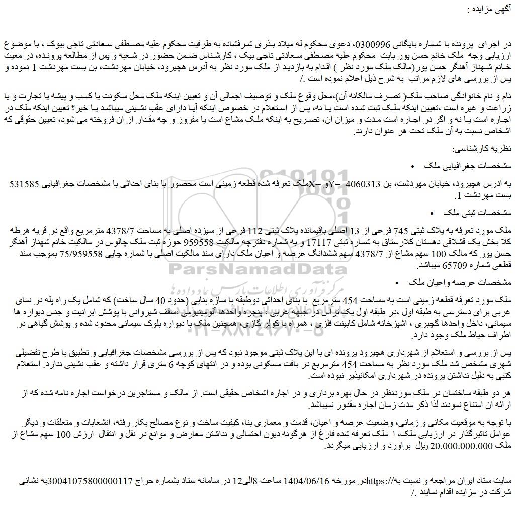 در اجرای پرونده با شماره بایگانی 0300996، دعوی محکوم له میلاد بذری شرفشاده به طرفیت محکوم علیه مصطفی سعادتی تاجی بیوک ، با موضوع ارزیابی وجه ملک خانم حسن پور بابت محکوم علیه مصطفی سعادتی تاجی بیک ، کارشناس ضمن حضور در شعبه و پس از مطالعه پرونده، در معیت خانم شهناز آهنگر حسن پور(مالک ملک مورد نظر ) اقدام به بازدید از ملک مورد نظر به آدرس هچیرود، خیابان مهردشت، بن بست مهردشت 1 نموده و پس از بررسی های لازم مراتب به شرح ذیل اعلام نموده است ./