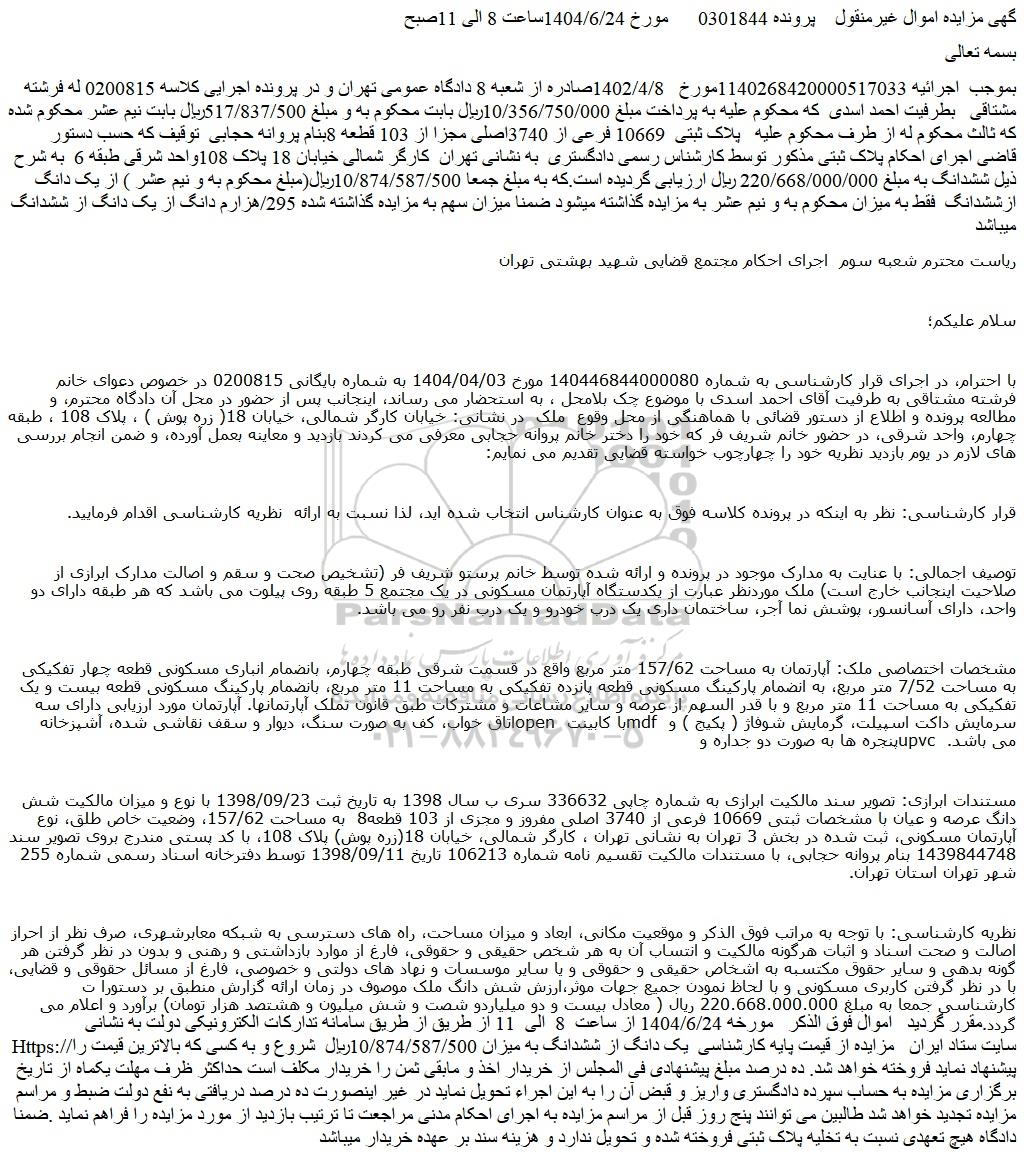 بموجب اجرائیه 1140268420000517033مورخ 1402/4/8صادره از شعبه 8 دادگاه عمومی تهران و در پرونده اجرایی کلاسه 0200815 له فرشته مشتاقی بطرفیت احمد اسدی که محکوم علیه به پرداخت مبلغ 10/356/750/000ریال بابت محکوم به و مبلغ 517/837/500ریال بابت نیم عشر محکوم شده که ثالث محکوم له از طرف محکوم علیه پلاک ثبتی 10669 فرعی از 3740اصلی مجزا از 103 قطعه 8بنام پروانه حجابی توقیف که حسب دستور قاضی اجرای احکام پلاک ثبتی مذکور توسط کارشناس رسمی دادگستری به نشانی تهران کارگر شمالی خیابان 18 پلاک 108واحد شرقی طبقه 6 به شرح ذیل ششدانگ به مبلغ 220/668/000/000 ریال ارزیابی گردیده است.که به مبلغ جمعا 10/874/587/500ریال(مبلغ محکوم به و نیم عشر ) از یک دانگ ازششدانگ فقط به میزان محکوم به و نیم عشر به مزایده گذاشته میشود ضمنا میزان سهم به مزایده گذاشته شده 295/هزارم دانگ از یک دانگ از ششدانگ میباشد