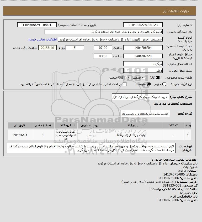 | 1 | -- | تابلوی چراغدار (شبرنگ) | عدد | کتاب، نشریات، تابلوها و برچسب ها | 1 | 1404/06/04 |