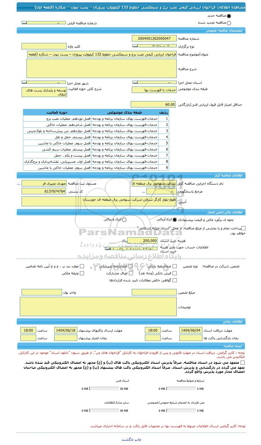 عنوان/موضوع مناقصهفراخوان ارزیابی کیفی نصب برج و سیمکشی خطوط 132 کیلوولت پیروزان – پست نبوت – شکاره (قطعه اول)