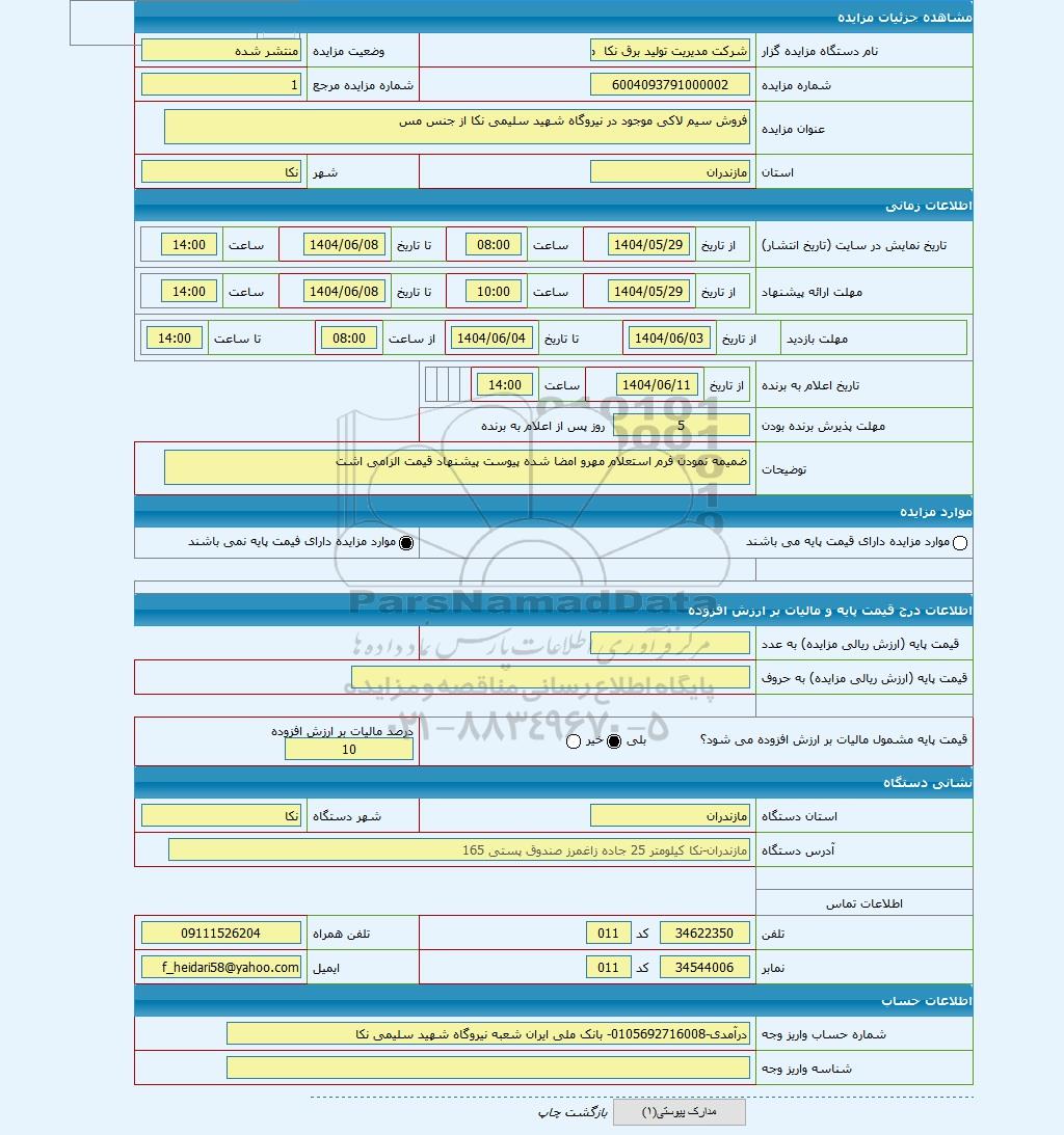| عنوان مزایده | فروش سیم لاکی موجود در نیروگاه شهید سلیمی نکا از جنس مس | |||