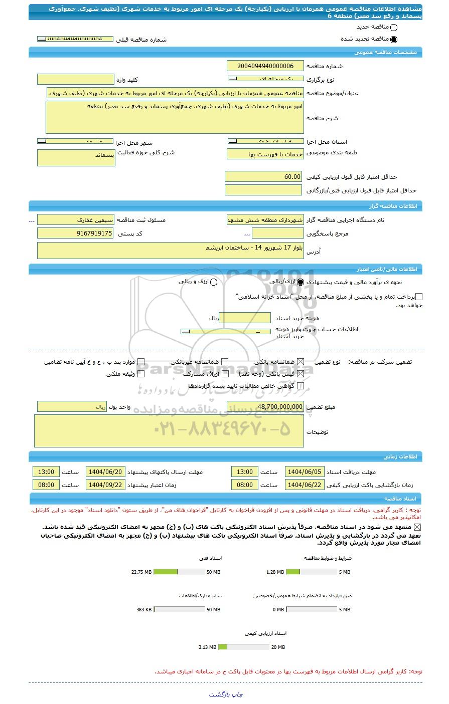 نام دستگاه اجرایی مناقصه گزارشهرداری منطقه شش مشهد استان خراسان رضویمسئول ثبت مناقصهسیمین غفاری