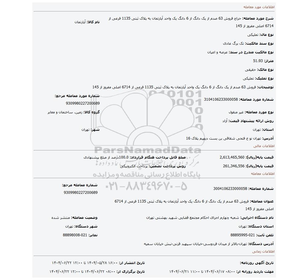 | شرح مورد معامله: حراج فروش 63 صدم از یک دانگ از 6 دانگ یک واحد آپارتمان به پلاک ثبتی 1135 فرعی از 6714 اصلی مفروز از 145 | نام کالا: آپارتمان | |