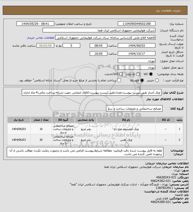 نام سازمان خریدار: شرکت هواپیمایی جمهوری اسلامی ایران هما