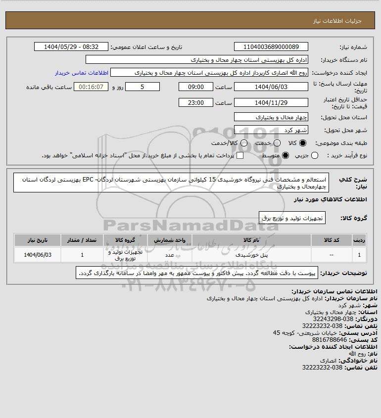 شرح کلی نیاز: استعالم و مشخصات فنی نیروگاه خورشیدی 15 کیلواتی سازمان بهزیستی شهرستان لردگان- EPC بهزیستی لردگان استان چهارمحال و بختیاری
