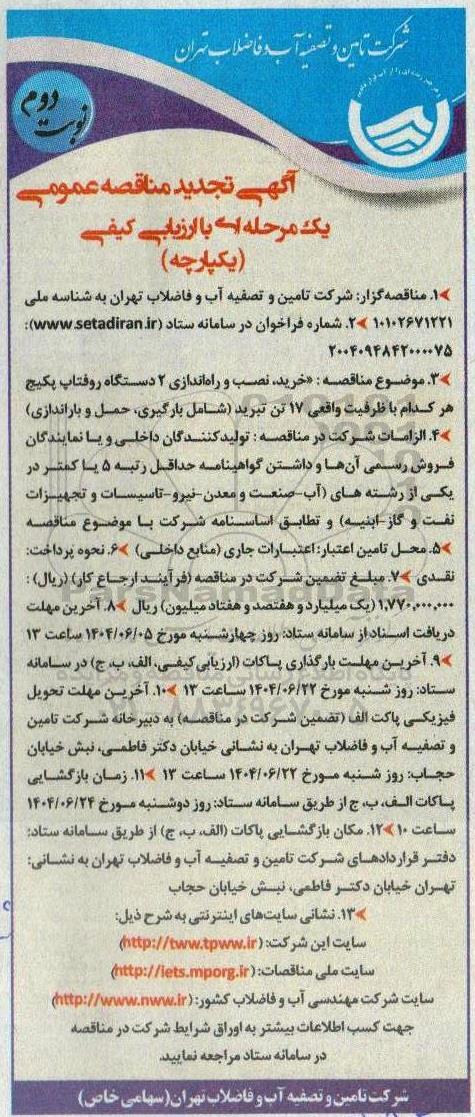 1- مناقصه گزار: شرکت تامین و تصفیه آب و فاضلاب تهران به شناسه ملی 10102671221