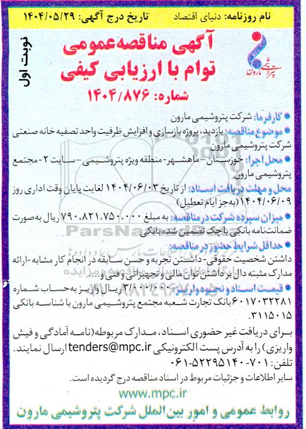آگهی مناقصه عمومی توام با ارزیابی کیفی شماره 1404/876 نوبت اول