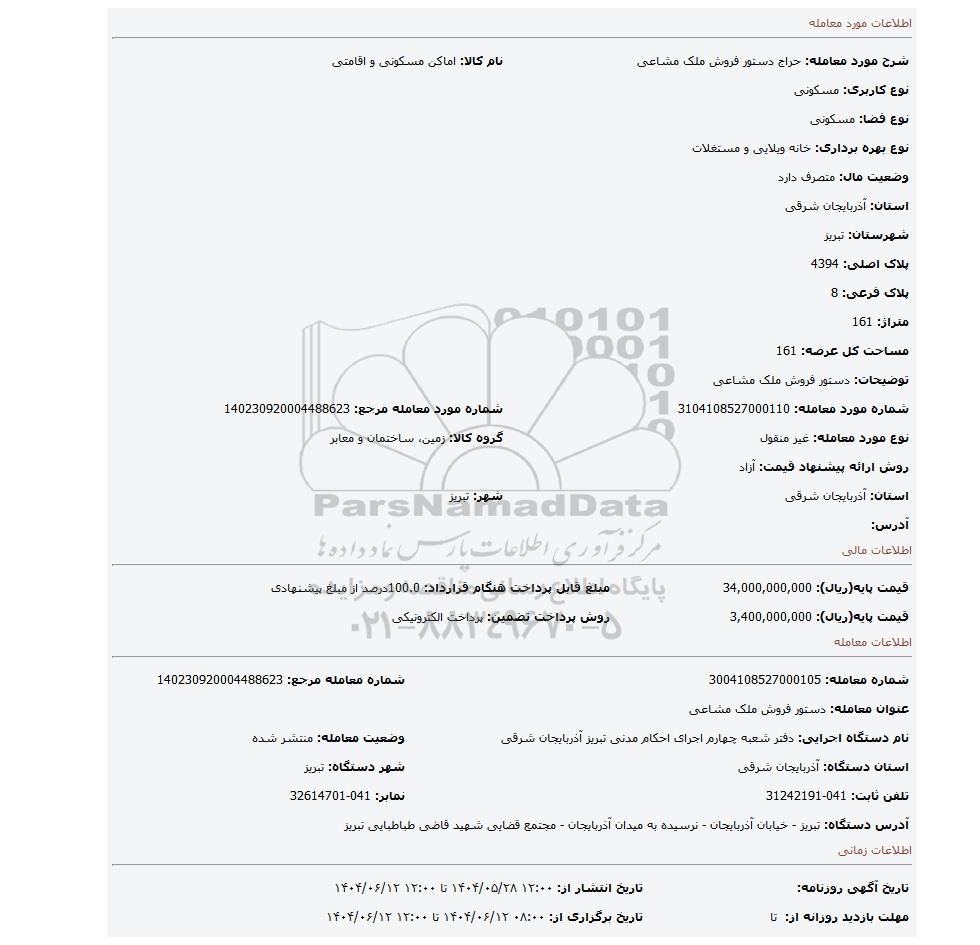 | شرح مورد معامله: حراج دستور فروش ملک مشاعی | نام کالا: اماکن مسکونی و اقامتی | |