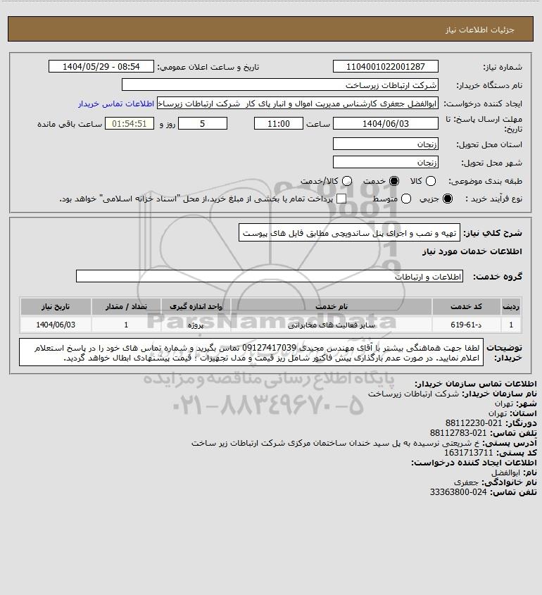 شرح کلی نیاز: تهیه و نصب و اجرای پنل ساندویچی مطابق فایل های پیوست