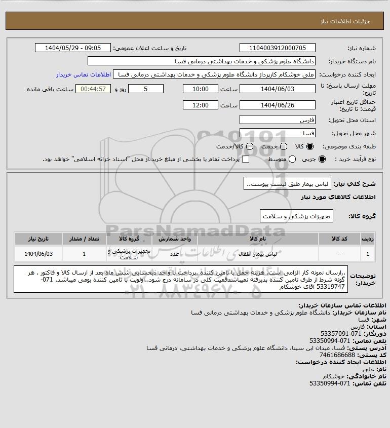 شرح کلی نیاز: لباس بیمار طبق لیست پیوست..